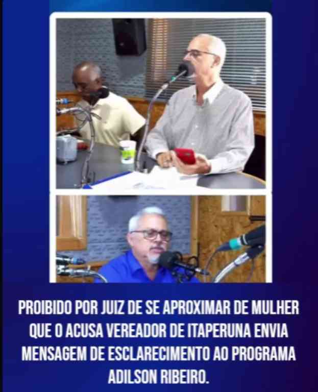 Sexta-feira – 21:58 – PROIBIDO POR JUIZ DE SE APROXIMAR DE MULHER QUE O ACUSA VEREADOR DE ITAPERUNA ENVIA MENSAGEM DE ESCLARECIMENTO AO PROGRMA ADILSON RIBEIRO. Veja Abaixo: